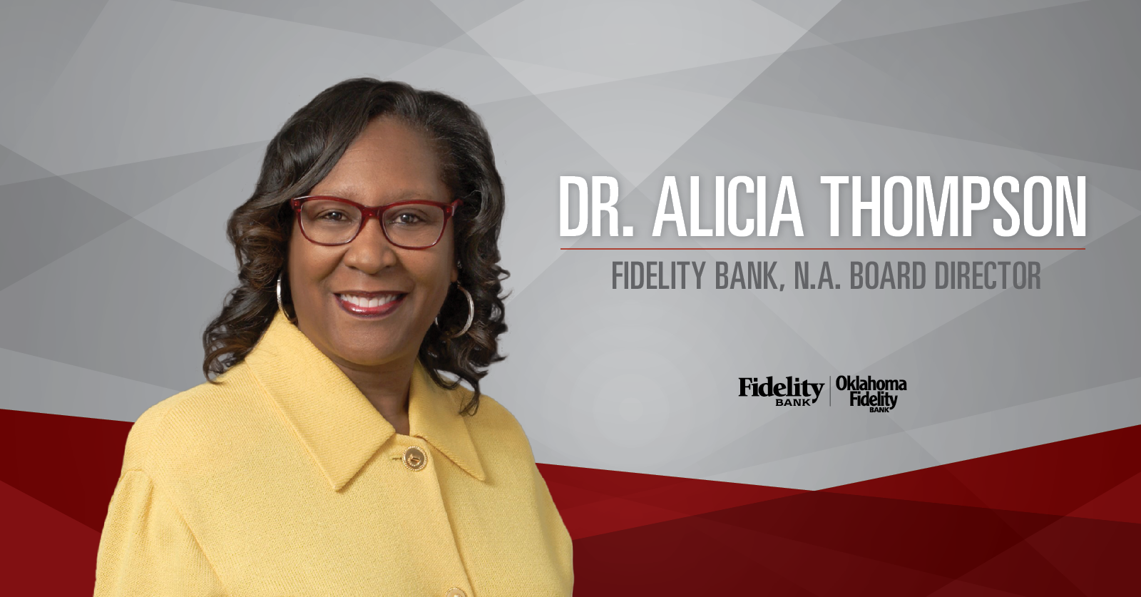 Retired Wichita Public Schools Superintendent Dr. Alicia Thompson has been elected to serve on the Fidelity Bank, N.A. Board of Directors. Dr. Thompson is the twelfth member of the board, which provides oversight to our $3.1 billion dollar bank with locations across Kansas and Oklahoma.